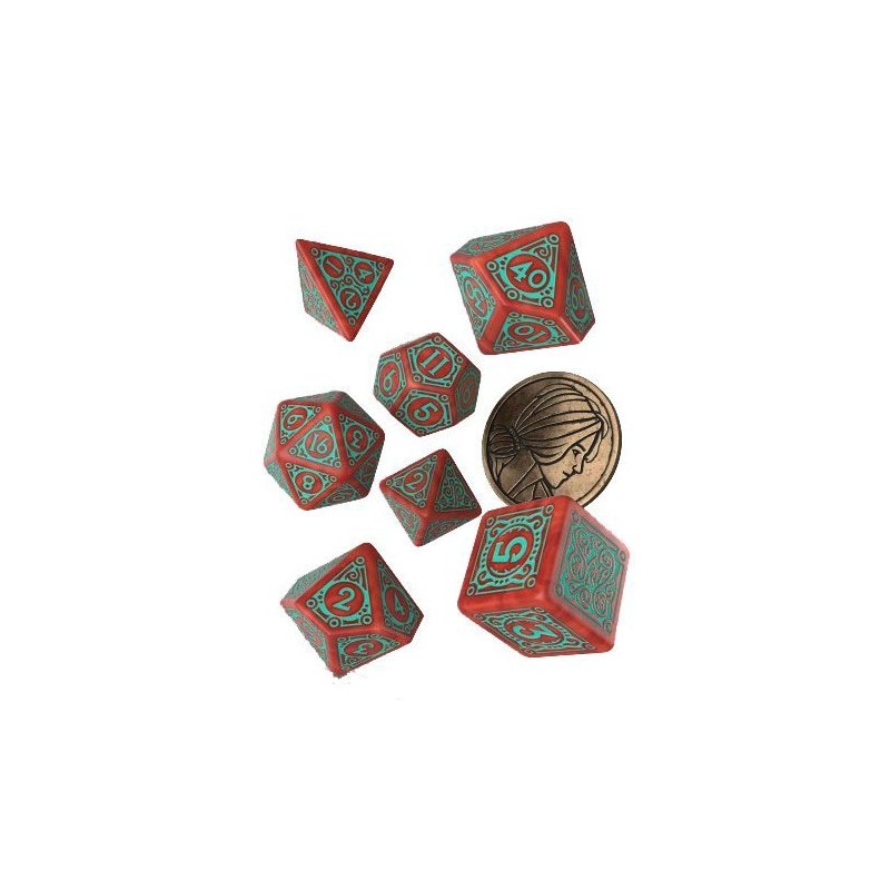 Inspired by The Witcher franchise, this dice set is dedicated to Triss Merigold of Maribor – the sorceress known for her amazing bravery in battle. The set contains 7 polyhedral dice, and a metal coin featuring Triss’ depiction. Each die is painted to caramel with turquoise engravings. The highest value faces, and coin reverse, share imagery with Triss’ pendant.
